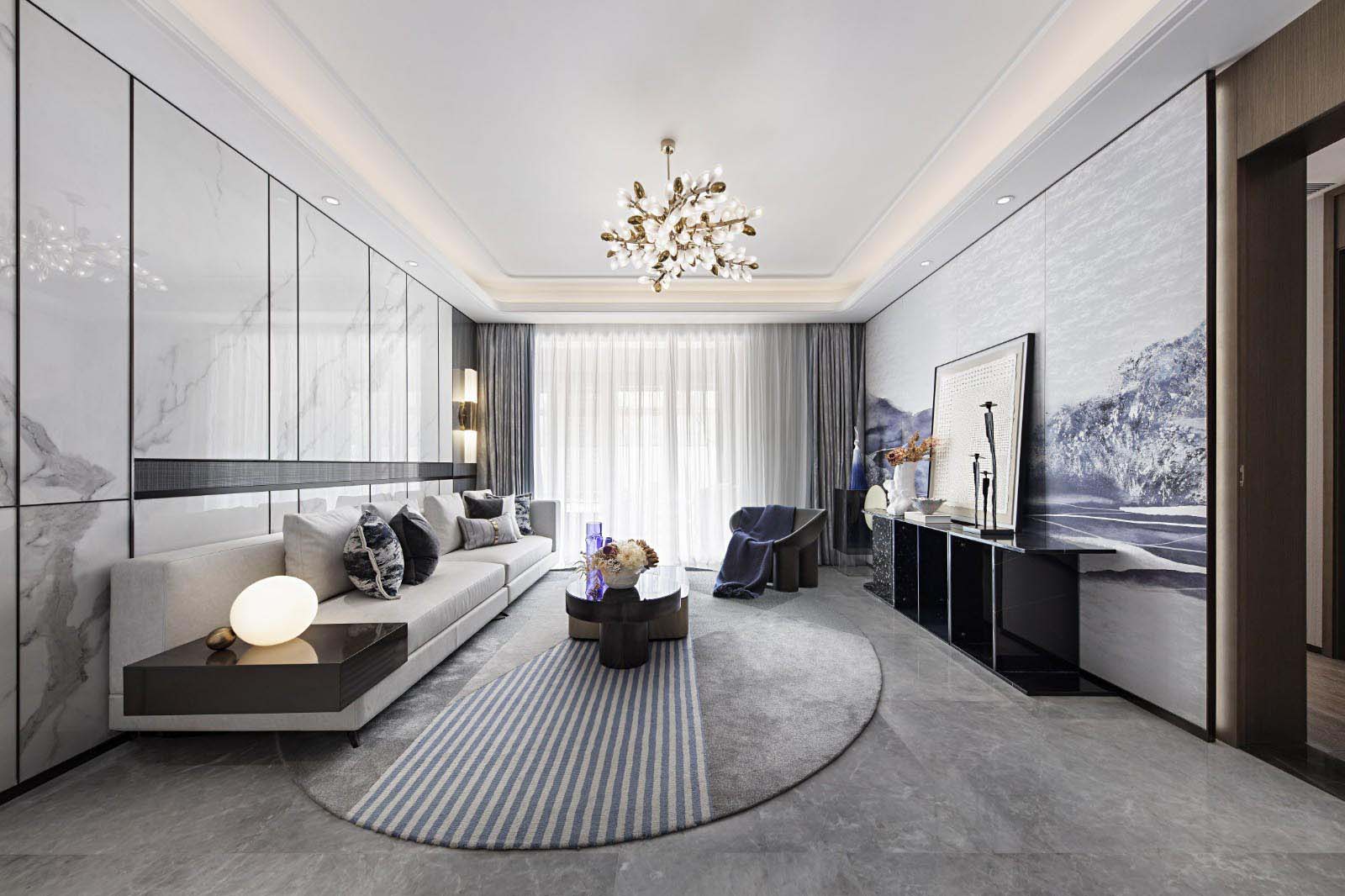 新中式風格是富含千年底蘊的東方中式風格與摩登時尚的現代風格彼此相遇結合,其精華之處在于以“一器一物皆是景,細微之處有乾坤”的古意為出發點,追隨時代的潮流,功能空間相互滲透,色彩空間相互碰撞,消除了傳統中式風格的沉悶和厚重,力圖在惹人癡迷的現代輕奢簡約中彰顯出傳統中式意蘊的雅致逸趣。